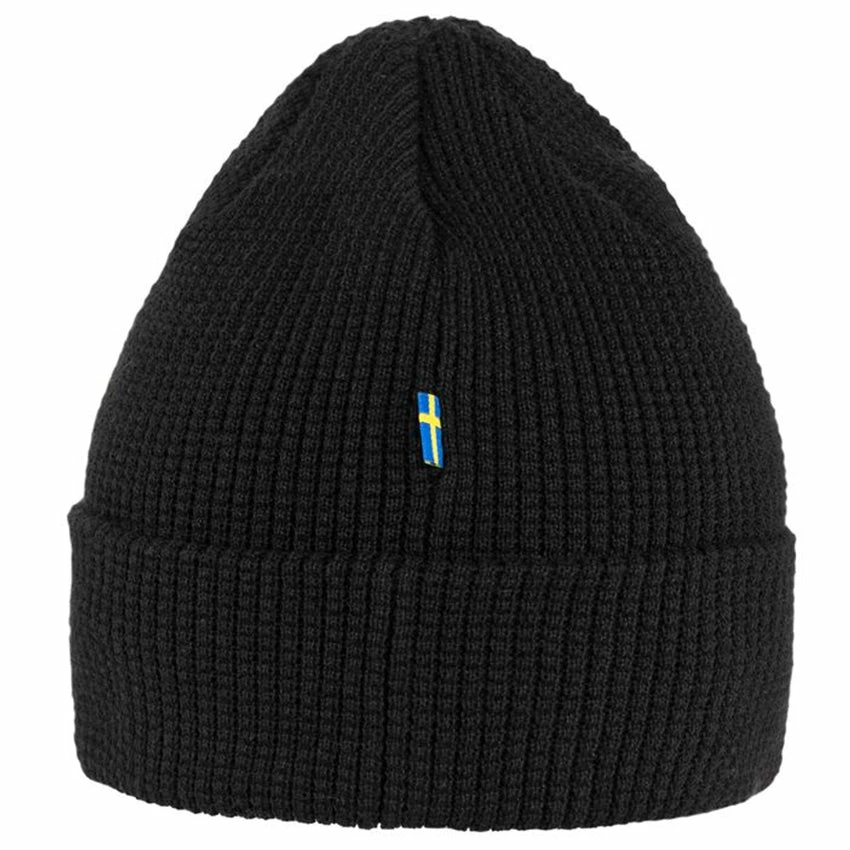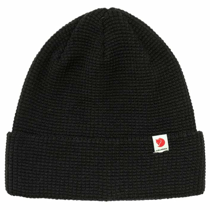 A soft, comfortable knitted hat from Fjällräven made from 100% recycled polyester. With a decorative waffle-knit and wide fold-up edge – the material of the Tab Hat wicks away moisture and dries fast, so it works well for both everyday life and when out on the hills. Small Fjällräven logo tab on the folded edge.