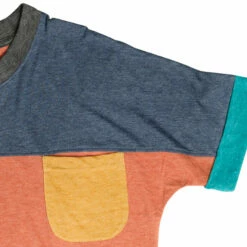 >A relaxed fit, dolman sleeve t-shirt dress, with ribbed crew neckline, rolled and tacked sleeve cuffs. The front yoke has a chest patch pocket, super useful on seam hand pockets, straight hem and the length hits at the mid-thigh.