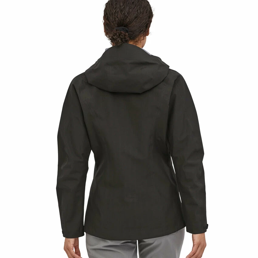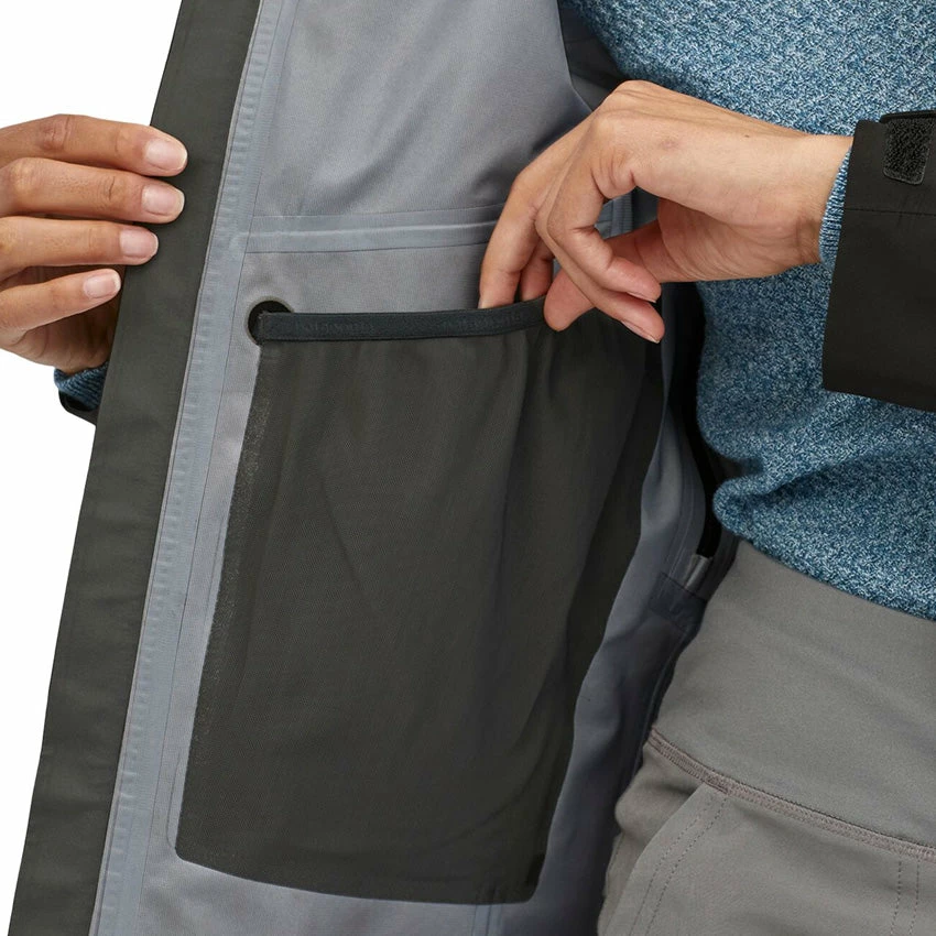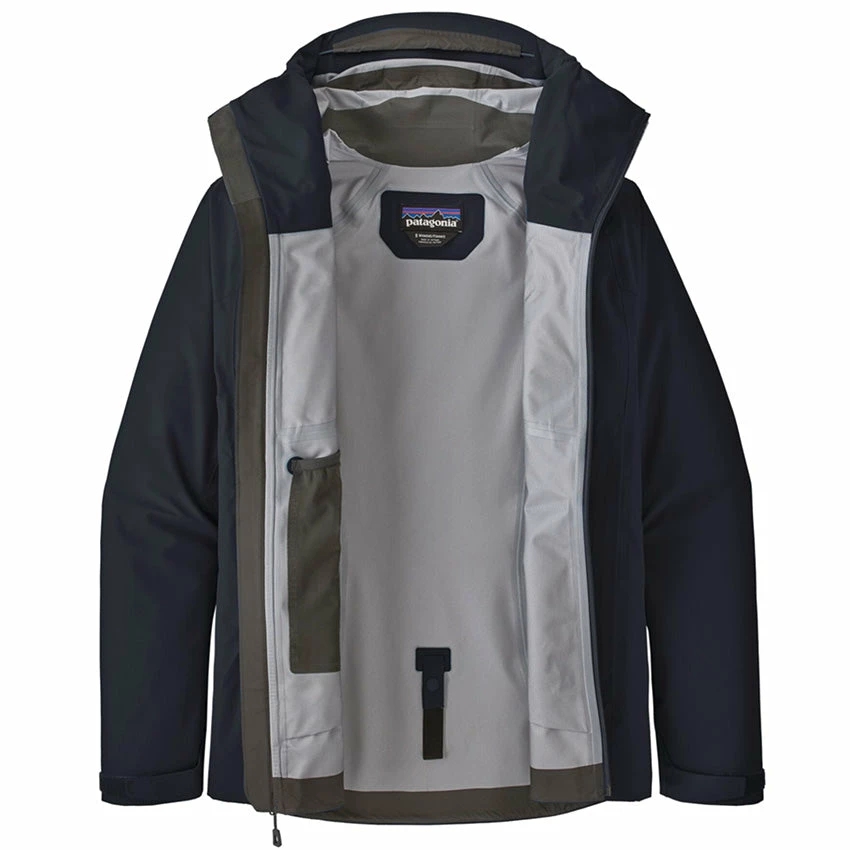 Welted, watertight two-way pit zips provide ventilation and reach without raising the body of the jacket. Low-profile cuffs use a tapered tab hook-and-loop closure for a tight wrist seal; a dual-adjust drawcord hem seals out weather. Elasticised strap at low back connects to any Patagonia Snow pants and select Alpine pants to prevent jacket from riding up.