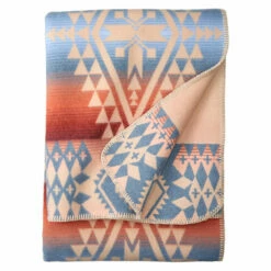 From Pendleton: âA dazzling rendition of our Canyonlands pattern, specially crafted and richly coloured to evoke a vintage blanket. One side is napped for softness and warmth; the reverse is unnapped, to showcase the designâs intricate jacquard. Hand-cut rounded corners recall the shape of heirloom blankets from the earliest days of our Oregon mill.â
