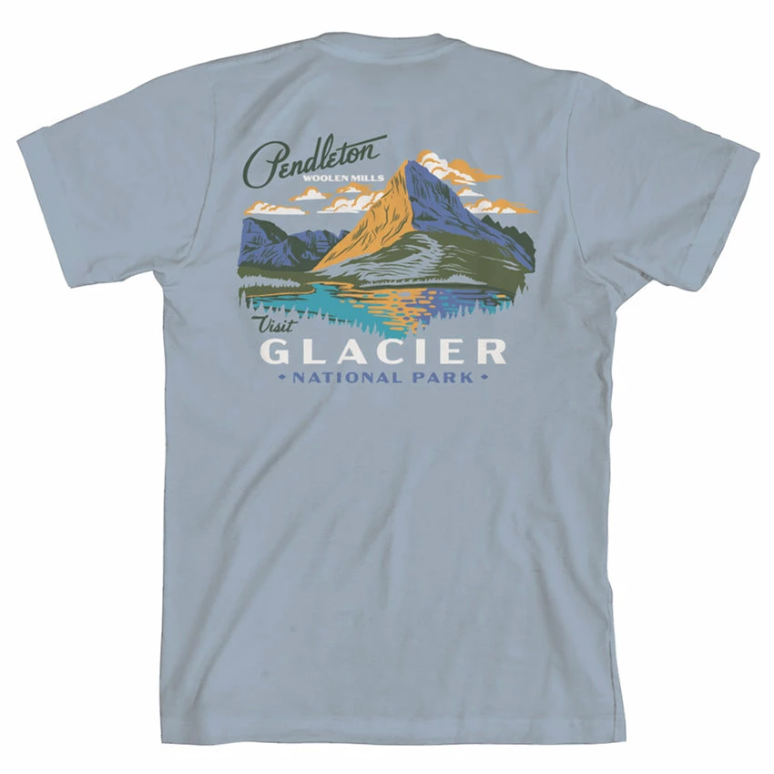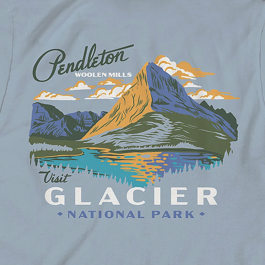 A super soft, combed cotton t-shirt from Pendleton with a vintage-inspired scene of Glacier National Park on the back and small Pendleton logo on the front left chest. Supreme quality and timeless style.