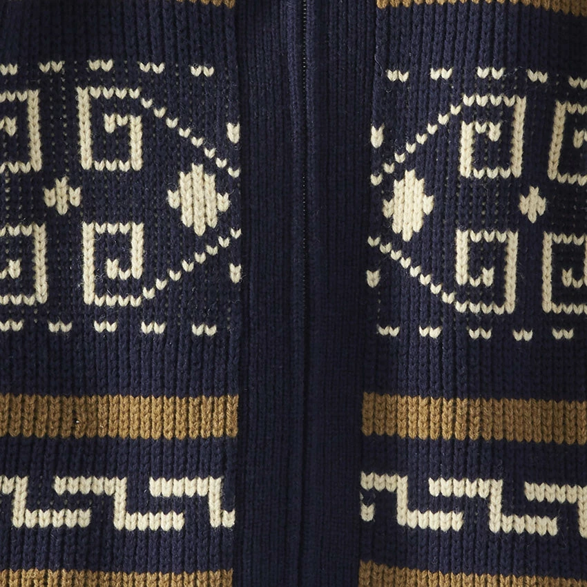 A chunky knit with traditional shawl collar, zip fastening and vintage patterns. Luxury knitwear construction, with a standard zip closure and ribbed cuffs and hem that deliver a closer fit and seal in the cosy warmth.